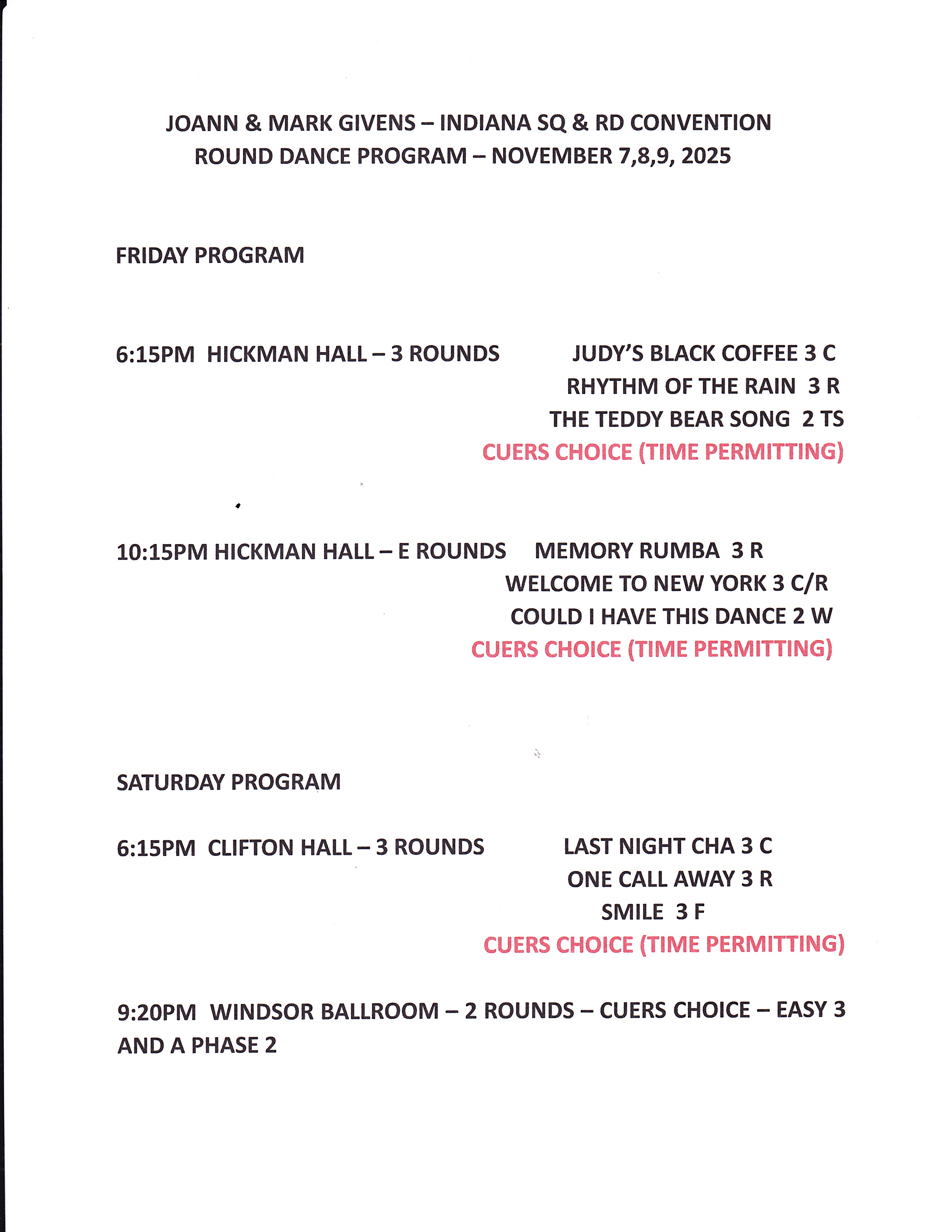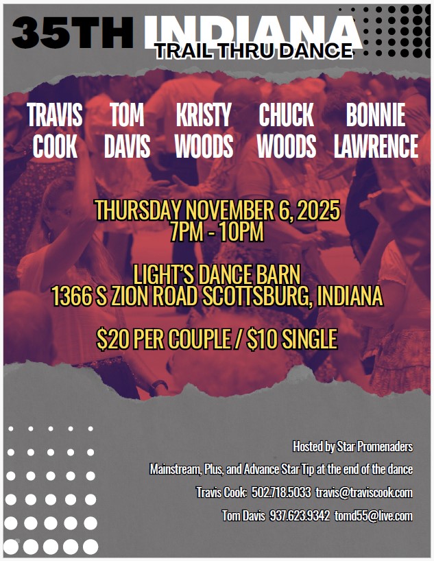 Indiana Square and Round Dance ConventionClick here to:Meet the 2025 Convention Board Members Register for the 2025 Convention See the 2025 Schedule Meet the 2025 Talent Register at the French Lick Resort For Solos See past convention stuff |