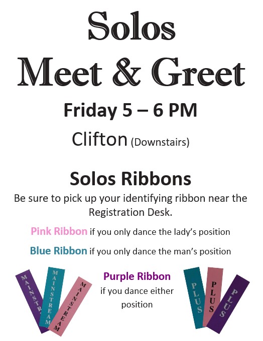 The Indiana Convention welcomes all dancers including solos. The Meet and Greet is a great way to meet other solos attending the convention. We also provide an area in the main hall where you can sit with other solos during the dance activities.